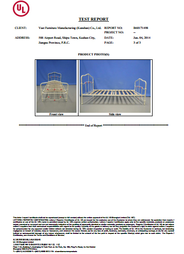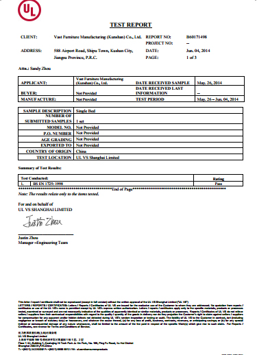 | BS EN 1725:1998(床架) BS EN 4875-7(儲(chǔ)藏家具) BS EN 747(雙層床) BS EN 62079:2001(沙發(fā)床) BS 8509:2008(小孩床) EN 716-1/2(兒童簡(jiǎn)易床) | BS EN ISO 14184(甲醛) BS 5852:2006(防火測(cè)試) EN 71-3(重金屬測(cè)試) E1 (木板) |